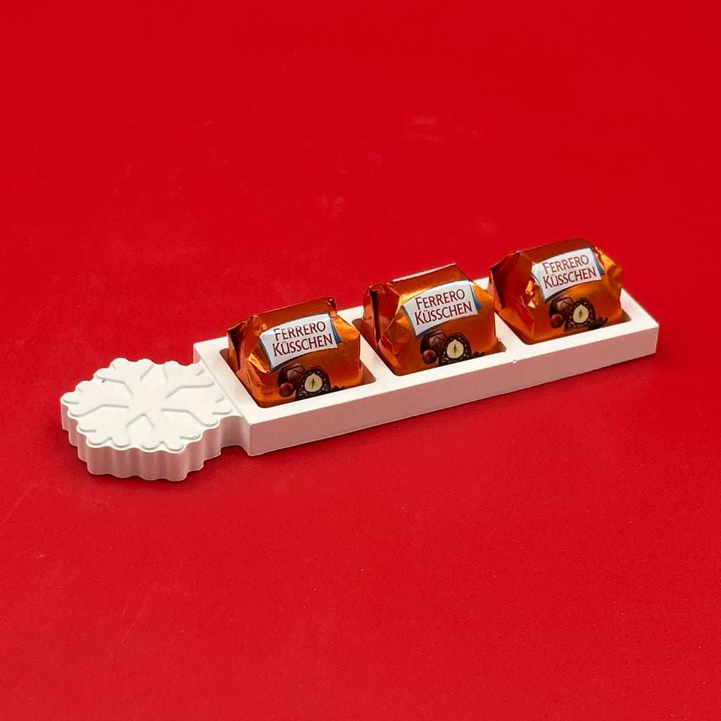 Ein liebevolles Geschenk für die kalte Jahreszeit: Drei Ferrero Küsschen werden stilvoll auf einem massiven, handgegossenen Deko-Element präsentiert. Die Schneeflocke ist fest im Design integriert, ebenso wie die Leiste für die Pralinen – alles aus einem einzigen Stück Deko-Gips, hochwertig und winterlich.
